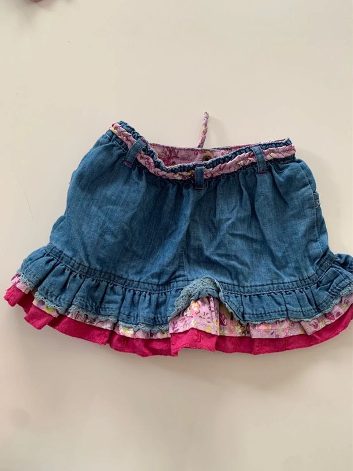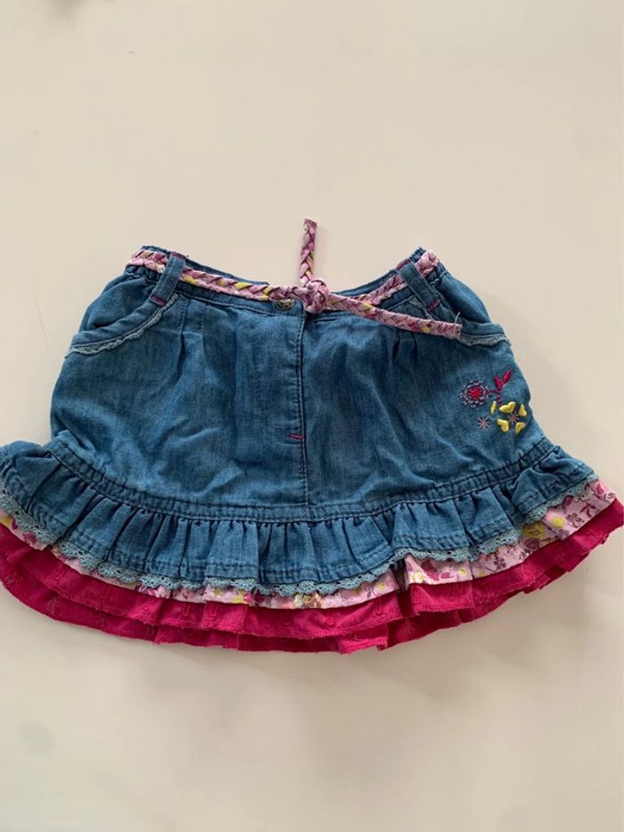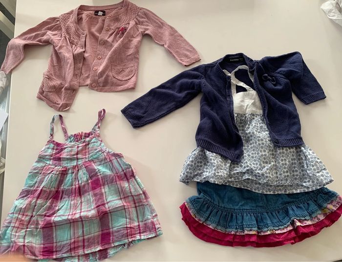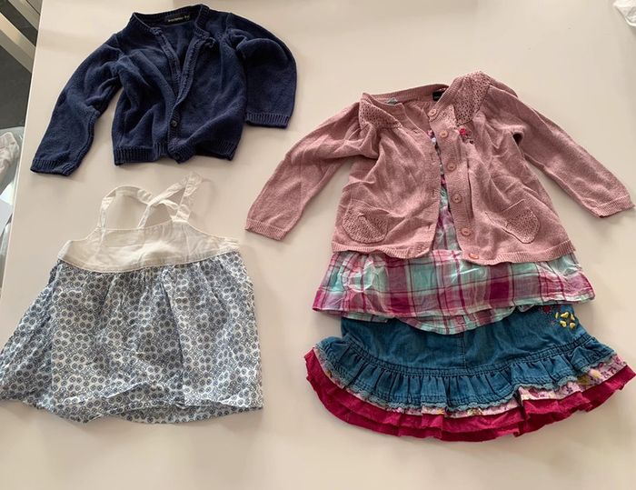 Lot comprenant: - 1 jupe gemo 23 mois - 1 blouse à bretelles motif gros carreaux tape à l’oeil - 1 blouse a bretelle blanche et bleu obaïbi 23 mois - 1 gilet rose pailleté sergent major - 1 gilet bleu in extenso L128 #mejuge23mois #mejuge24mois