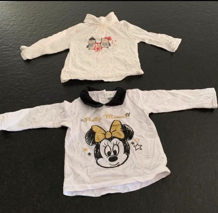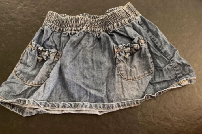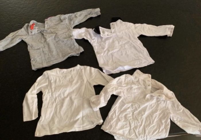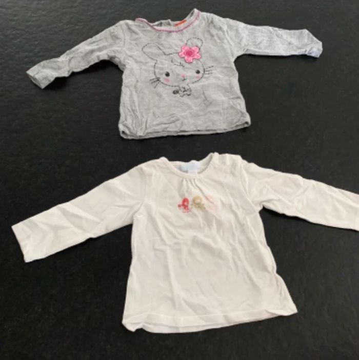 Lot comprenant quatre T-shirts manches longues en coton fermer par pression à l’arrière Une jupe en jean. L2 #mejuge12mois