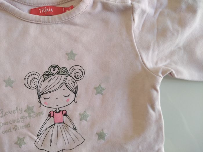 Robe manches longues Marque TISSAIA taille 18 mois Couleur rose clair, et paillettes sur les dessins Il y a quelques petites tâches sur le haut de la robe (cf photo), sinon très bon état