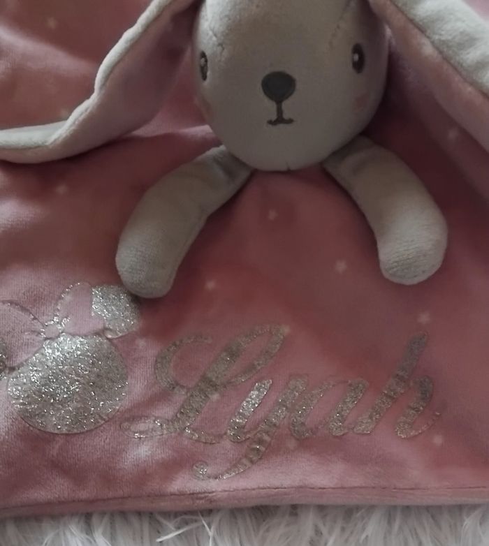 Doudou carré plat en velours de couleur rose et étoile blanche Lapin sur le milieu du doudou Motif imprimé mini et prénom Lyah en argenté Attache tétine sur le côté du doudou