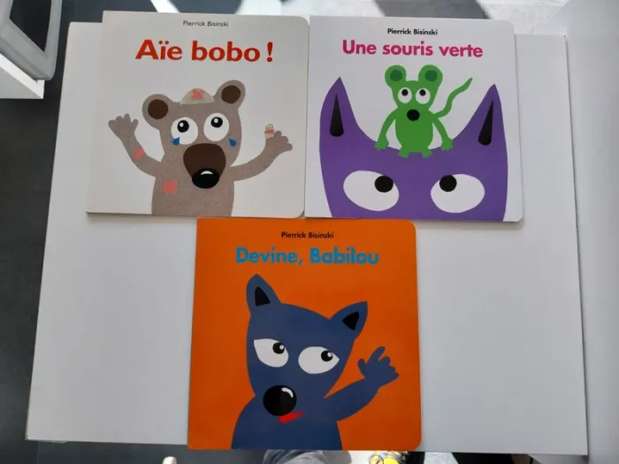 Lot de 3 albums de pierrick bisinski Aie bobo Une souris verte Devine babilou