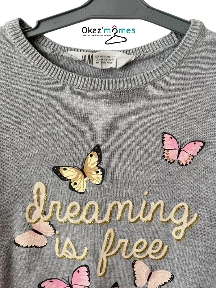 Pull fin gris “dreaming is free” (papillons) - H&M 110/116cm (4-6ans)