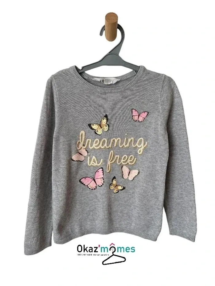 Pull fin gris “dreaming is free” (papillons) - H&M 110/116cm (4-6ans) - photo numéro 1