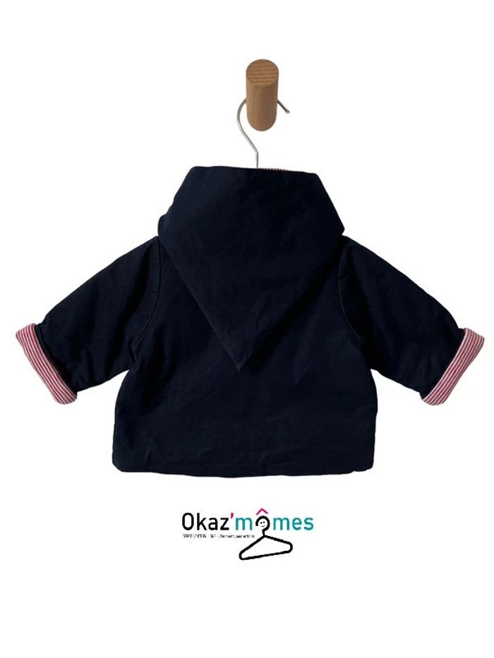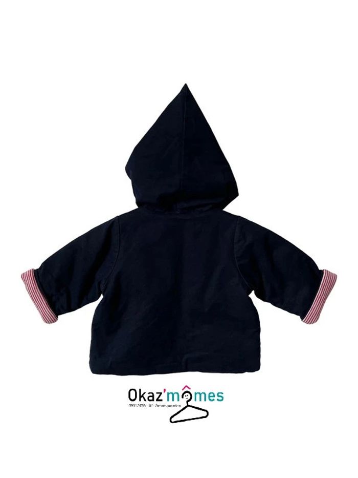 Veste à capuche pointue bleu marine, intérieur milleraies rouge