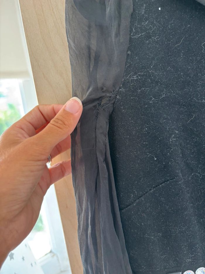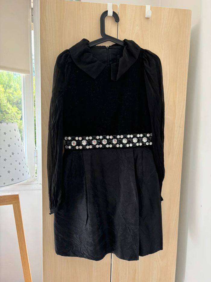 Robe noire vintage chic avec détails brillants Jolie robe noire au style vintage, manches longues en voile, col original et ceinture ornée de strass brillants. Elle a une belle structure et un effet légèrement bouffant au niveau de la jupe. Fermeture zippée dans le dos. À noter : la couture sous l’aisselle est abîmée (voir photo), nécessitant une petite couture. Parfaite pour un look rétro ou une customisation originale ! Taille : 38 Envoi rapide et soigné.