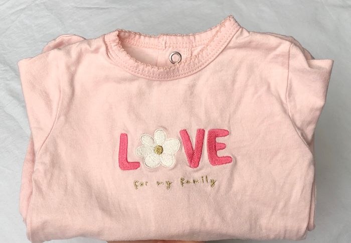 En coton rose clair, inscription brodée : “Love for my familly” en rose, blanc et doré.