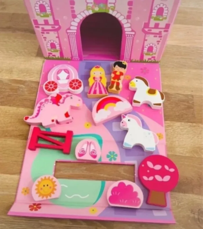 ~ bon état Mallette qui contient 12 pièces en bois ~ 1 princesse ~ 1 prince ~2 licornes ~1Dragon ~1 carrosse ~ 1 buisson ~ 1 arbre ~ 1 soleil 1 arc en ciel ~ 1 paire de chaussure ~1 clôture #jouetbois #jouetboisprincesse