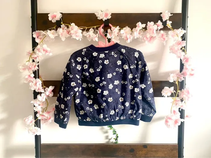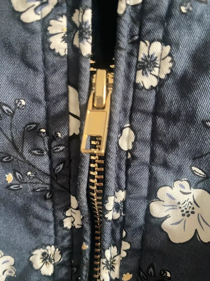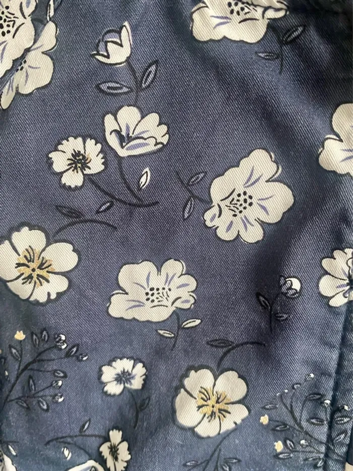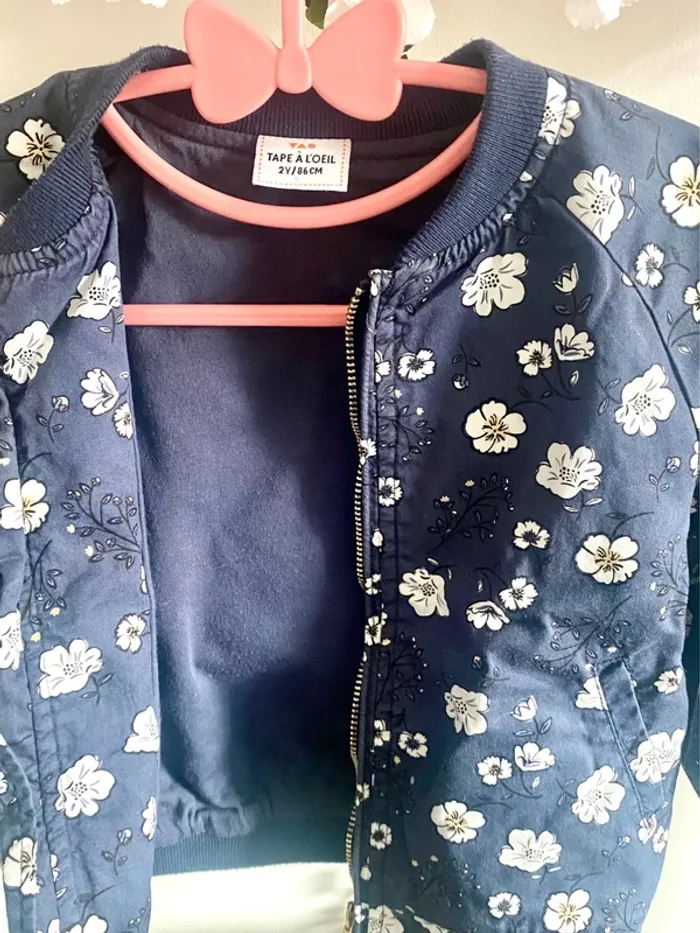 Veste liberty bleue marine Avec fleurs blanches Matière type jean Marque TAO / Tape à l’Oeil Taille 23 mois Très agréable à porter et jolie avec un jean Très bon état, qq bouloches à l’intérieur Sans trou ni tache Vendu 7€