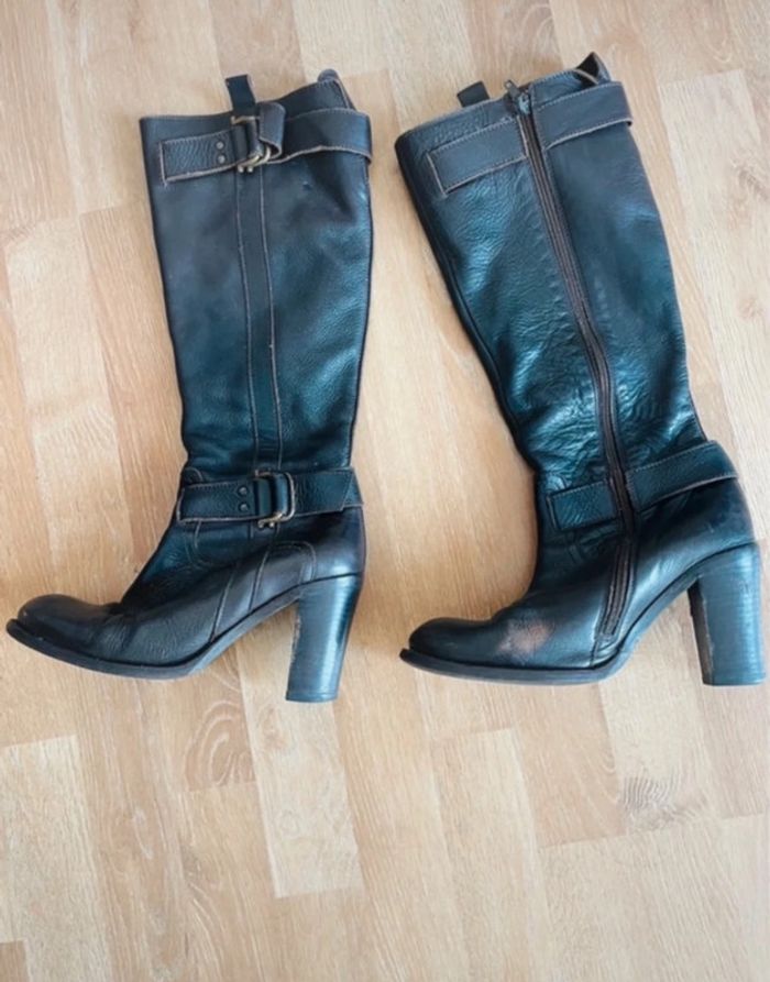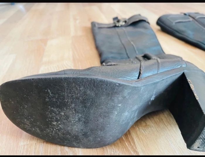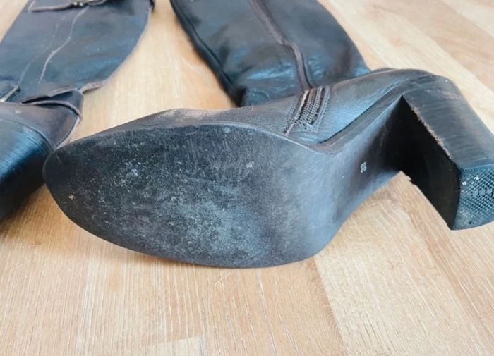 ~État satisfaisant Bottes à ressemeler plus de semelles, il faut un bon coup de cirage. Un talon est un peu abîmé ( voir photos) Je ne me souviens plus de la marque c’était une marque italienne. Je l’ai avais payé 350 euros au galerie Lafayette. ~Talon : 8,5cm ~taille 38 N’hésitez à faire un lot il y’a des réductions ☺️ 2 articles 5% 3 articles 10% 4 articles 15% 5 articles 20%