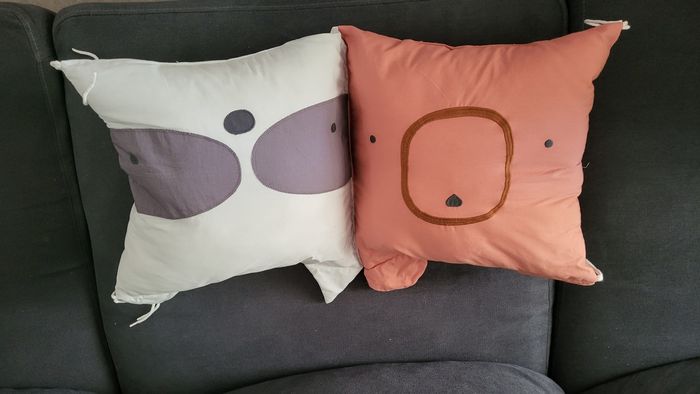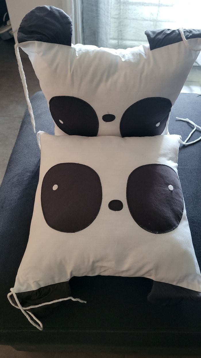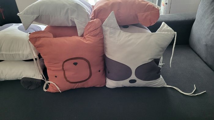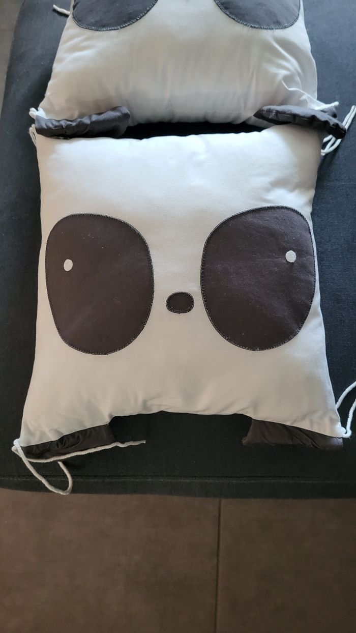 Tour de lit très bon état: - 4x2 coussins gris/rouge-orange - 2 cousins panda Toutes les attaches sont sur les coussins. Pas de tâches, pas de déchirures, toujours bien rembourrés. Je vends le lot complet.