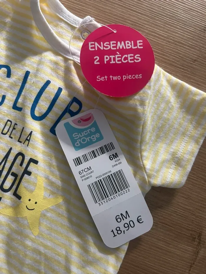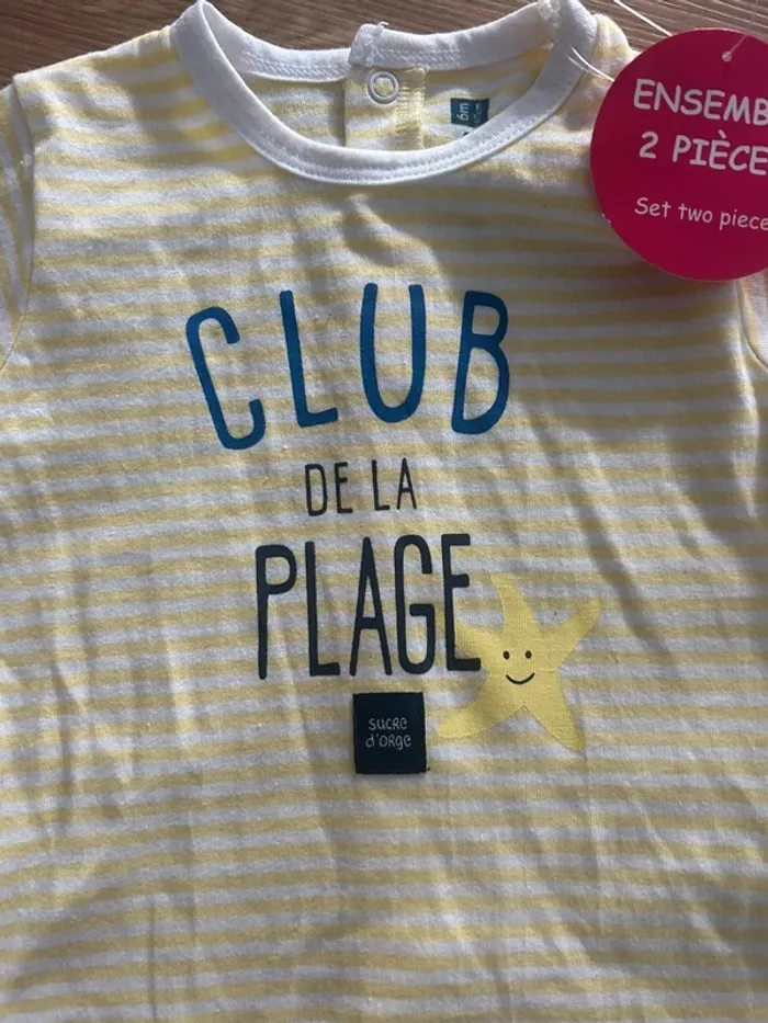 Ensemble T-shirt et short NEUF avec étiquette, T shirt blanc à petites rayures jaune, Avec inscription « Club de la plage » avec une étoile de mer. Ouverture à pressions sur tout l’arrière du dos Short bleu. Taille 6 Mois de la marque Sucre D’orge 📦 Envois rapide et soignée. 📢 Remise activée jusqu'à 15%, et payé qu'un seul frais d'envois ! #tetell29_bbgarcontaille6mois #NEUF #Etiquette #Ensemble #Baby #Ete #Short #TShirt #Boy #TBE #Quimper