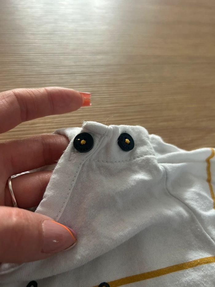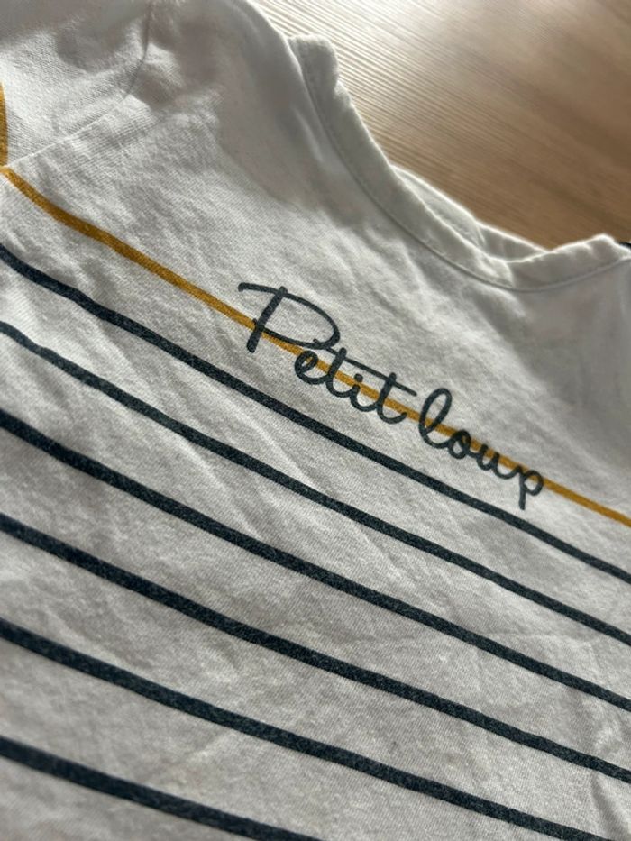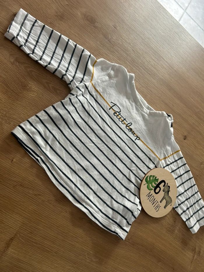 T shirt blanc manches longues avec fines rayures bleu marine et moutarde. Avec inscription « Petit Loup » 2 boutons au col pour faciliter le passage de la tête. Taille 6 mois de la marque TAO En très bon état. 📦 Envois rapide et soignée. 📢 Remise activée jusqu'à 15%, et payé qu'un seul frais d'envois ! #tetell29_bbgarcontaille6mois #TAO #TapeALoeil #TShirt #Rayure #Mariniere #TBE #Boy #Baby #Quimper