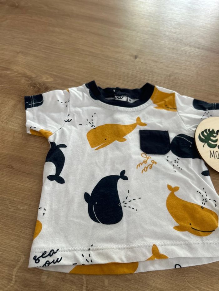 Jolie T shirt baleine avec de jolies couleurs jaune et bleu marine, facile à associer.