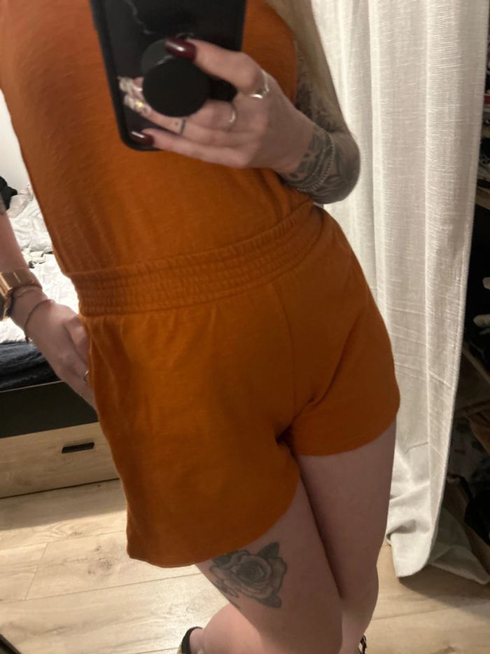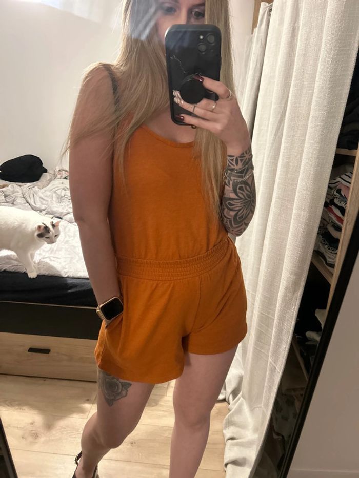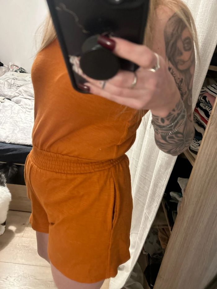 Combinaison short, dos ouvert, deux petites poches, taille élastiqué, bretelles réglables. Couleur orange/rouille Marque TAO, taille XS. En très bonne état 📦 Envois rapide et soignée. 📢 Remise activée jusqu'à 15%, et payé qu'un seul frais d'envois ! #TAO #Combinaison #tetell29_tailleXS #tetell29_taille34