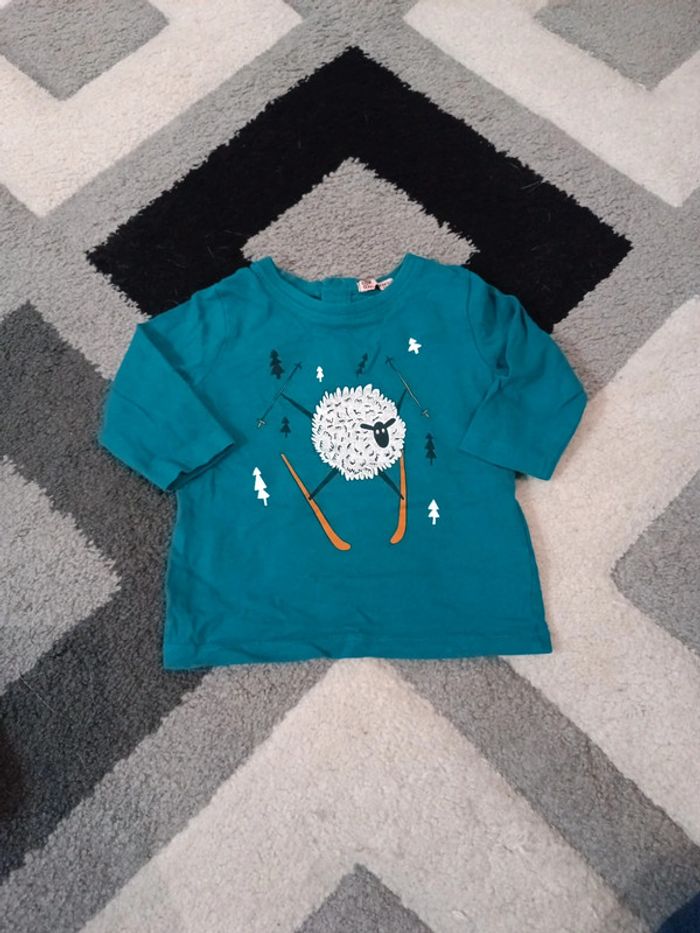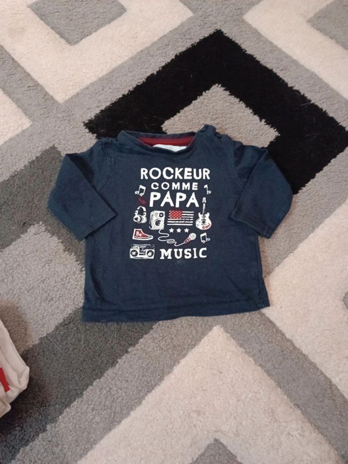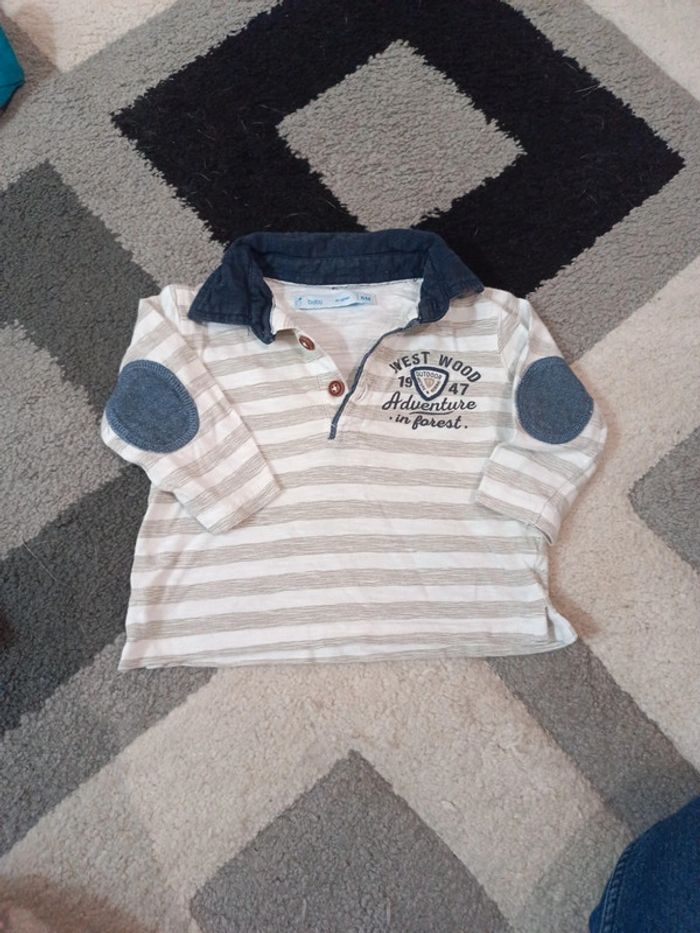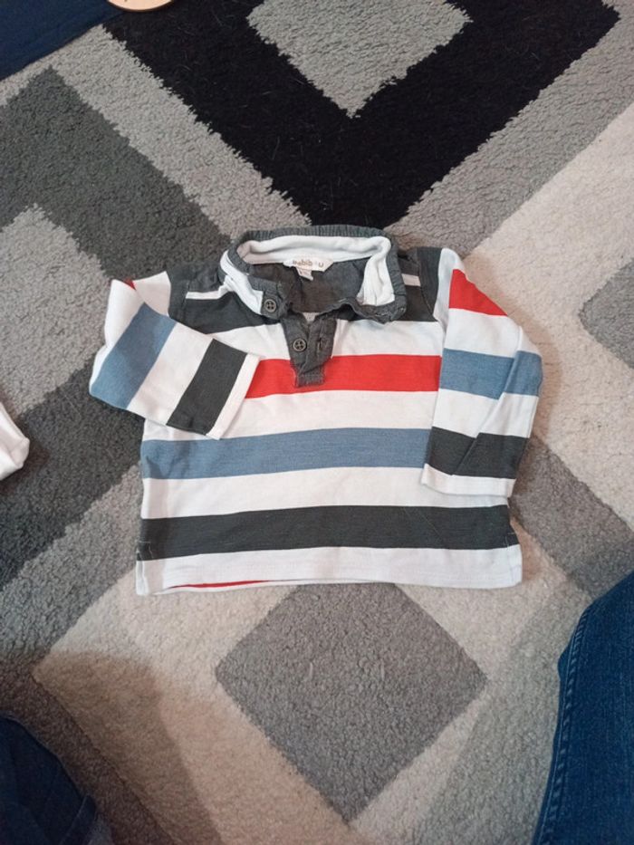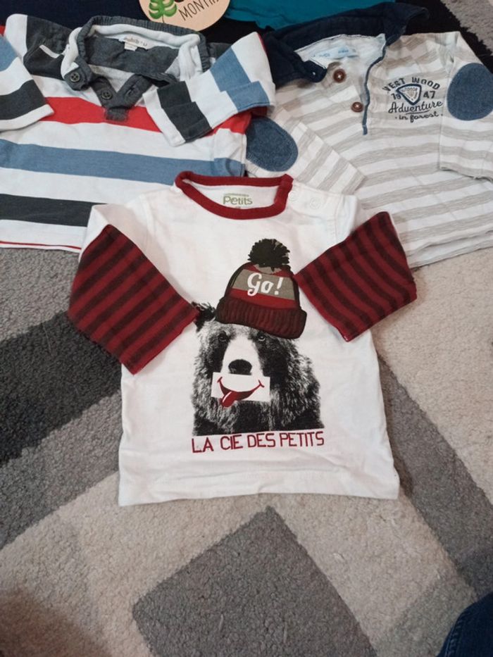 Lot de 5 hauts comportant : - 3 Tee shirt manches longues : L'ours de marque la compagnie des petits, tissus assez épais, très bonne état, Rockeur comme papa de la marque Gémo, en bon état, Le mouton de la marque DPAM, très bonne état, Et 2 Polos manches longues: Un rayé gris de la marque Gémo, très bonne état, Un rayé rouge de la marque Babibou, en très bonne état. Le tout en taille 6Mois 📦 Envois rapide et soignée. #tetell29_bbgarcontaille6mois