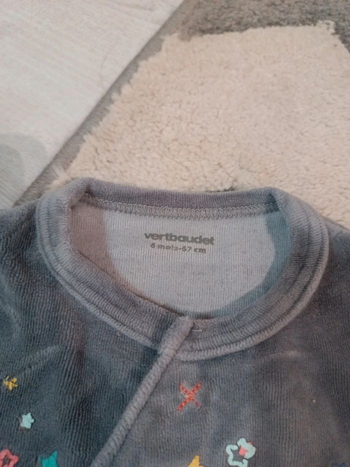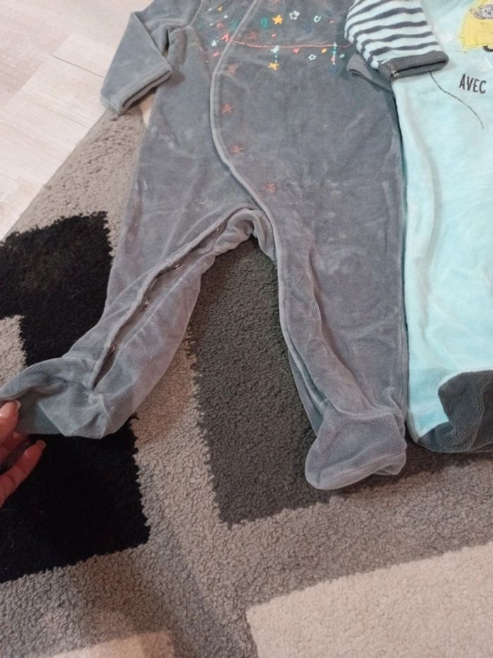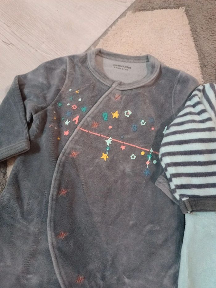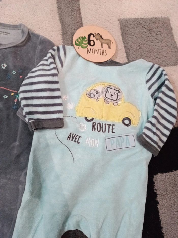 Lot de 2 pyjamas : - Le gris de Verbaudet (imprimé flocage abîmé voir photo), ouverture à pressions sur le devant et jambes, sinon très bon état. - Le bleu de Gémo, très bon état, pressions dans le dos #tetell29_bbgarcontaille6mois