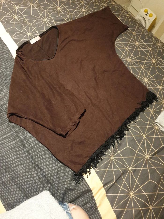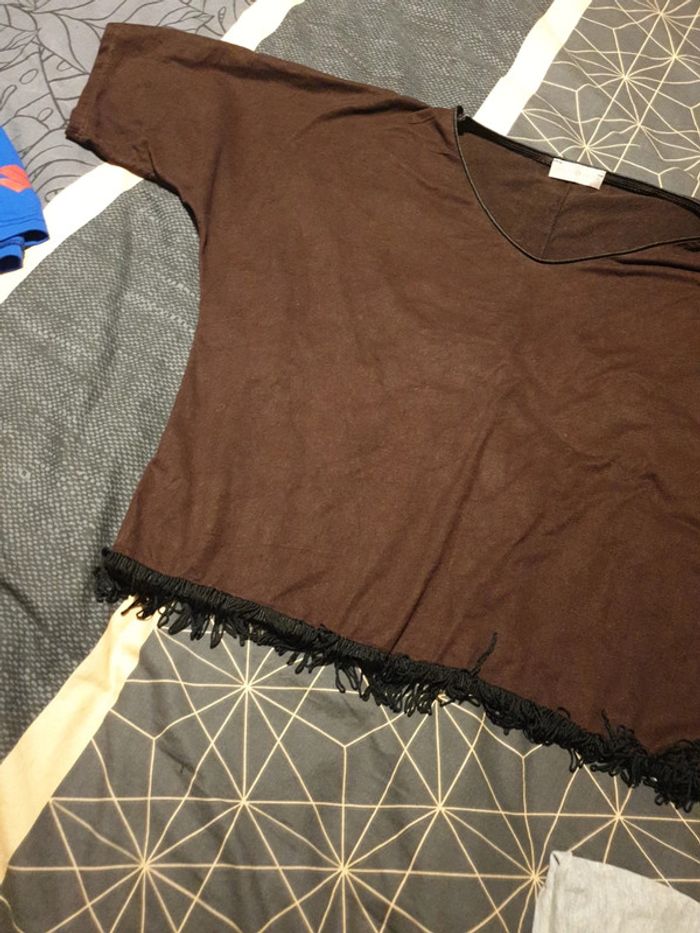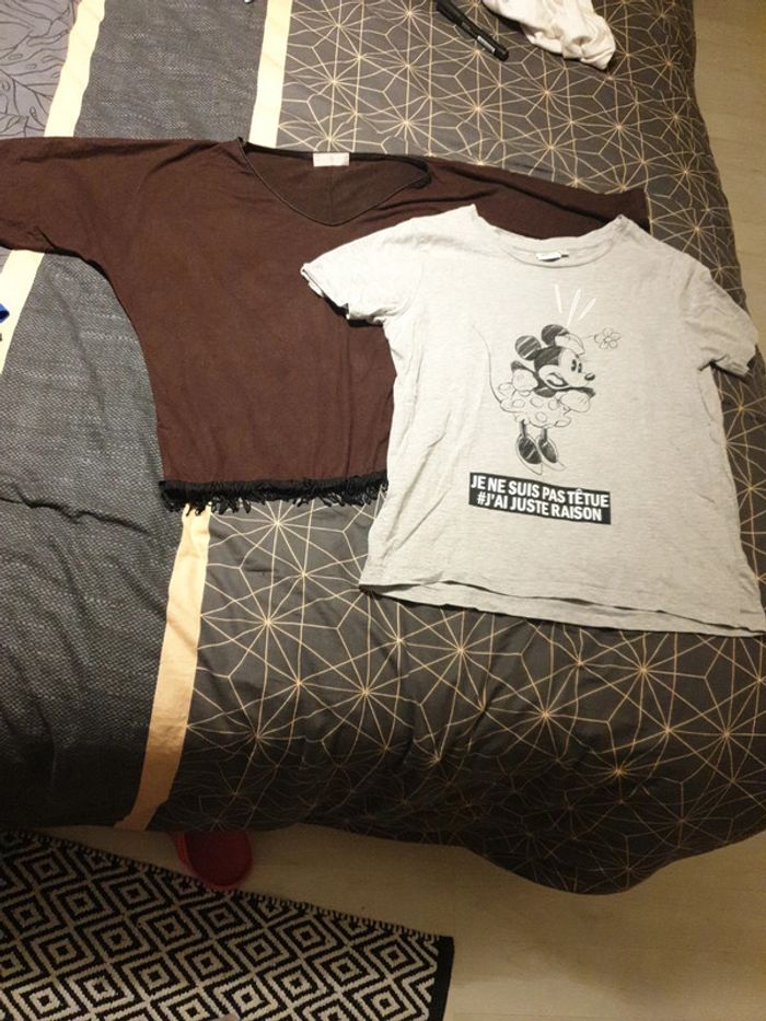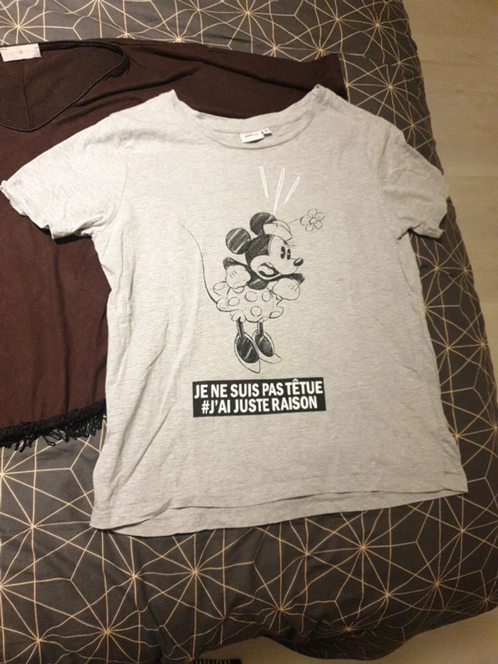 Lot de 2 T shirt en taille S Un tee shirt en matière suédine couleur prune avec petite frange en bas, col V, de la marque cache cache Et un tee shirt gris clair avec Minnie accompagner d'une phrase , gemo (Lot n°6) #tetell29_tailleS #tetell29_taille36