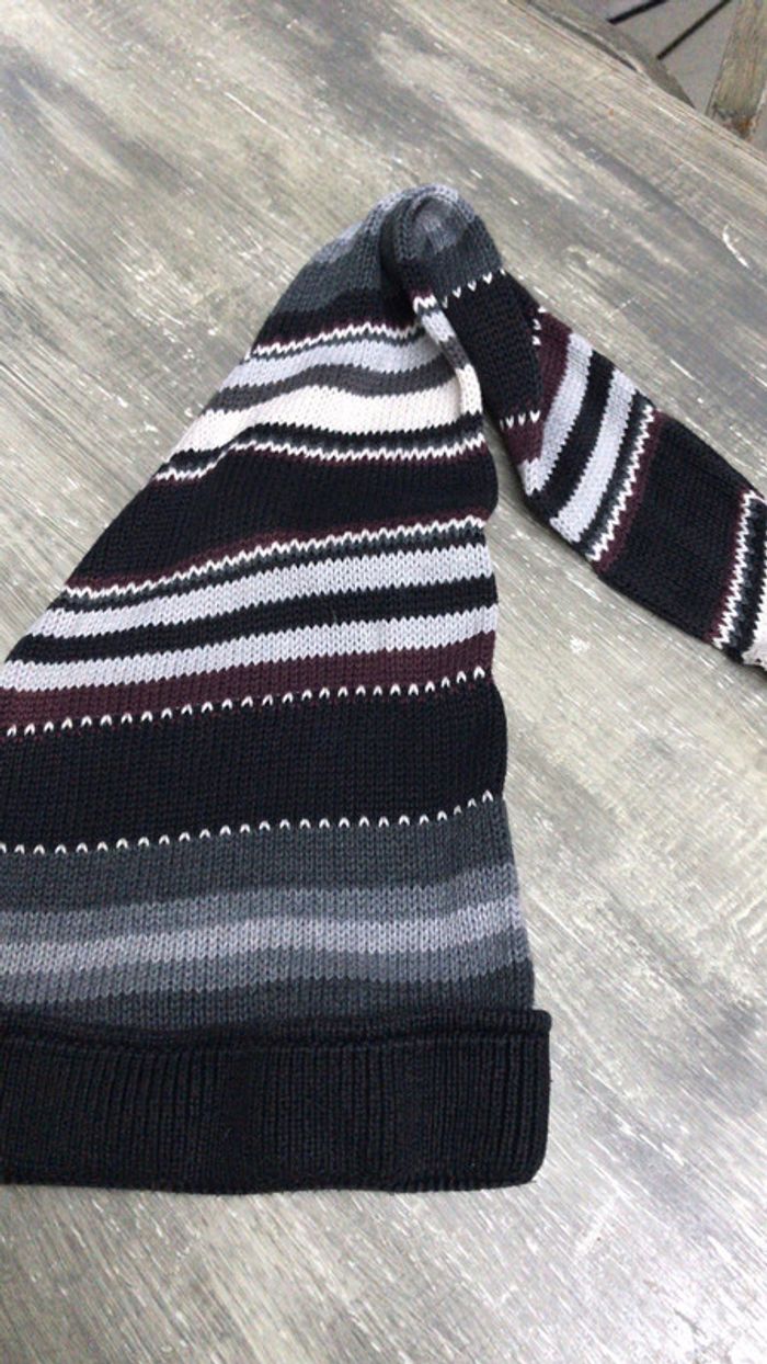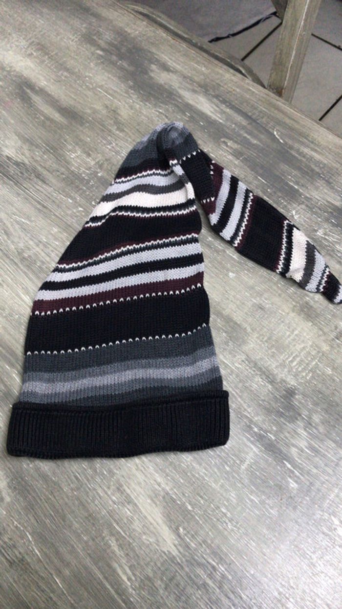 Long bonnet. Ton gris,noir, blanc et brun.