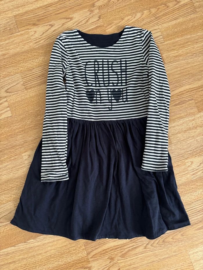 Côté face tout le haut est à rayures bleu et blanc avec inscription Chush on you et la jupe est toute bleu marine