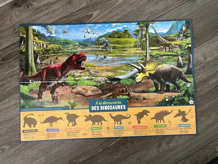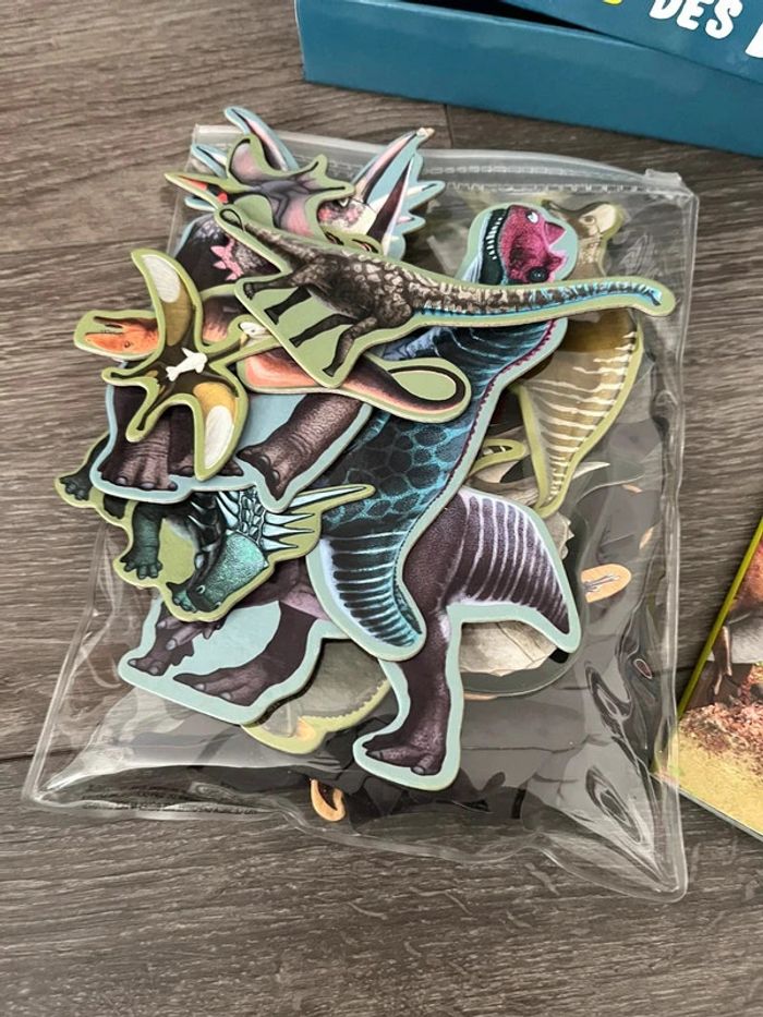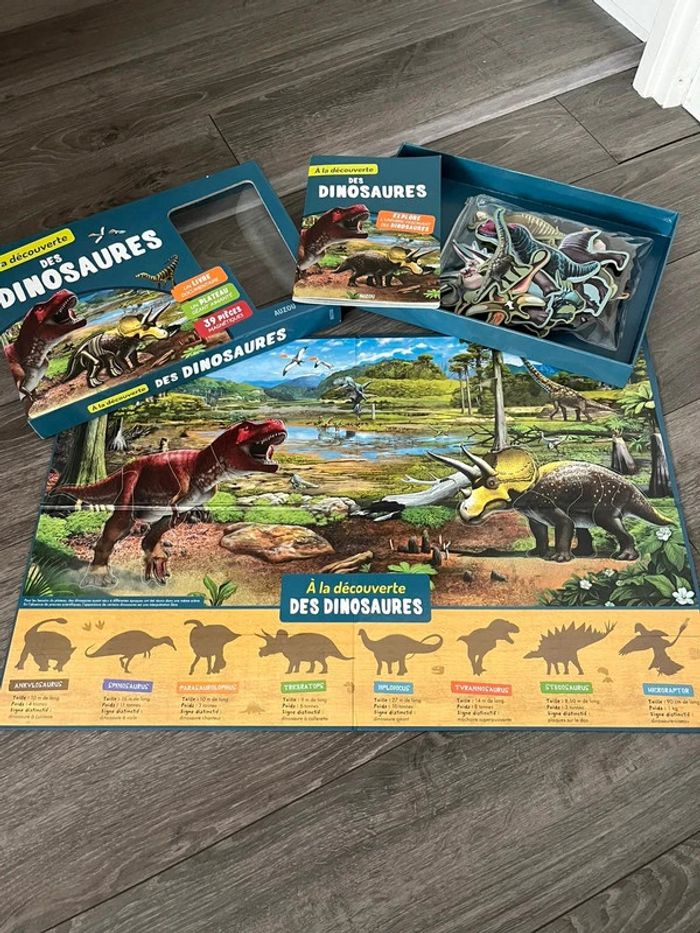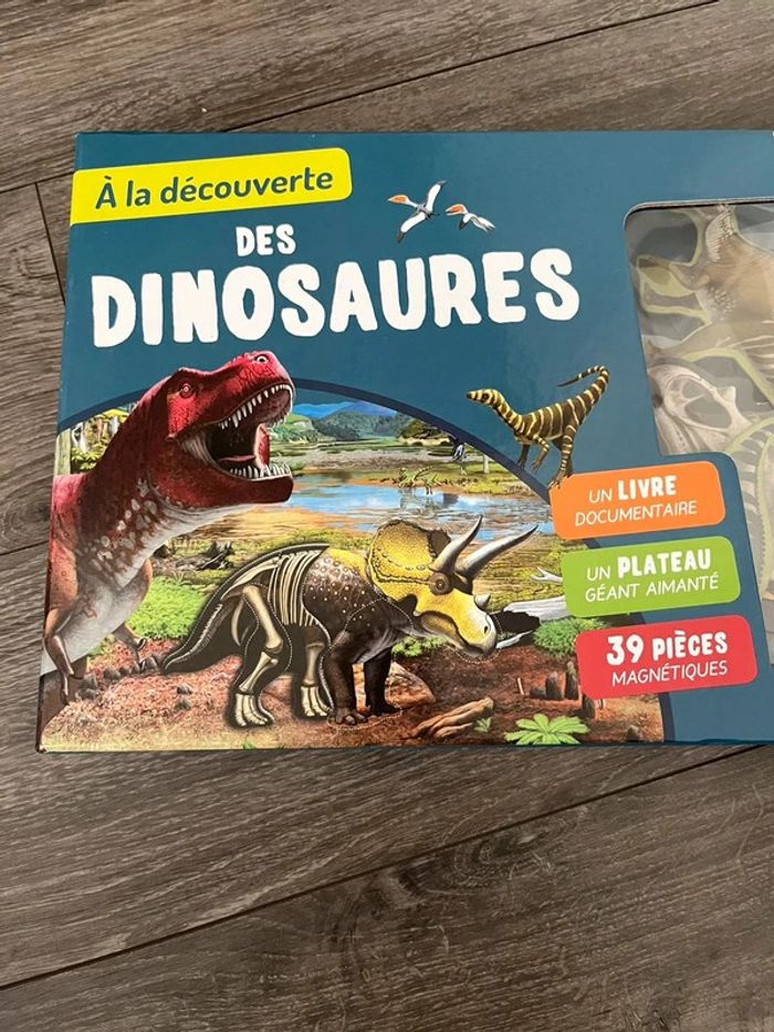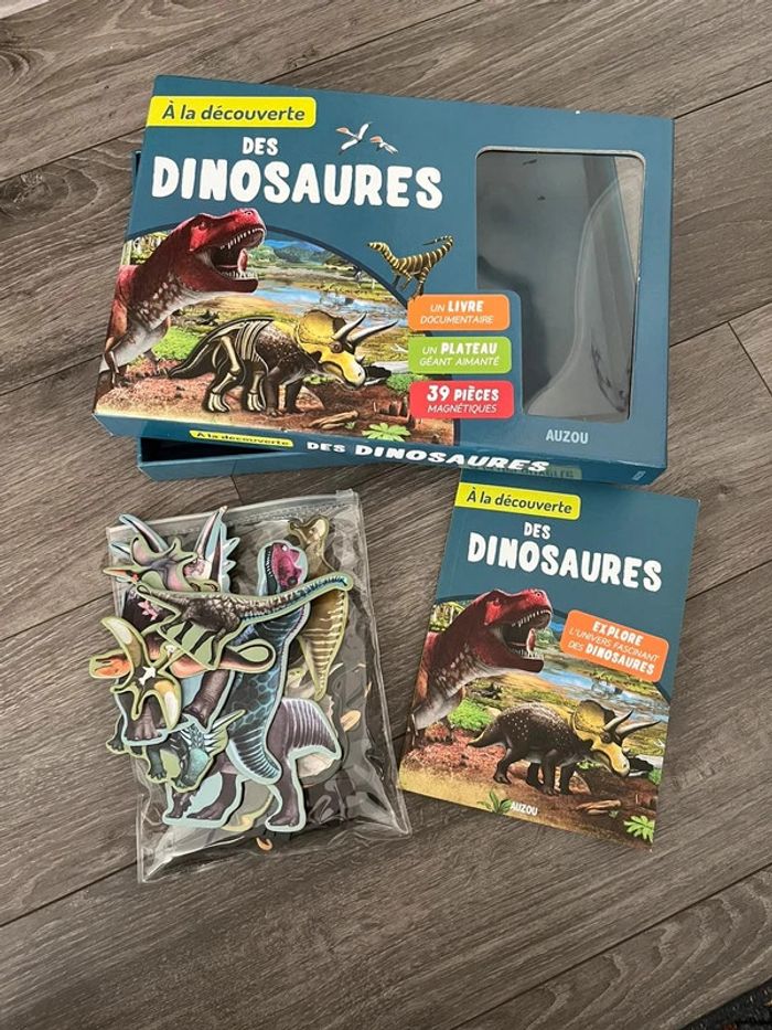 Coffret comprend un livre documentaire de 64 pages pour tout savoir sur les dinosaures, ainsi que + de 35 aimants à replacer sur un grand plateau aimanté. Parfait pour les fans de dinosaures :)