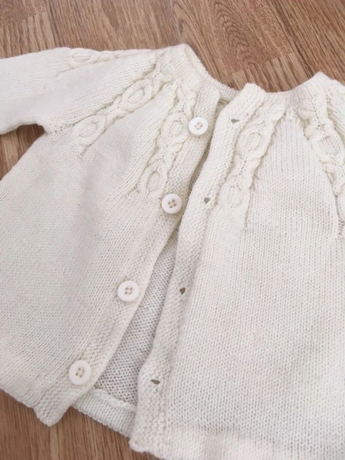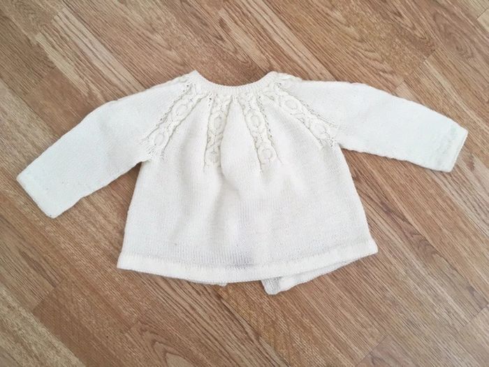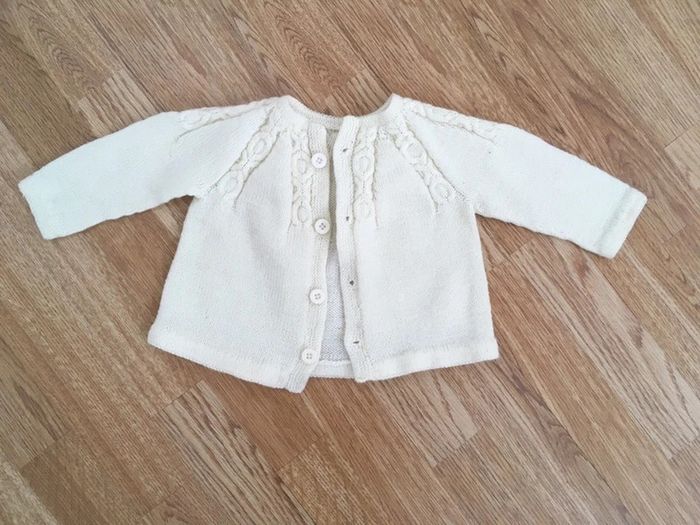 Gilet fille de couleur blanc cassé, en bon état. Pour voir mes autres articles dans des tailles similaires, cliquez ici : #ds91220_6mois #ds91220_9mois #gilet #giletbébé #brassièrebébé #cardiganbébé #pullbébé #pull #brassière #cardigan #bébé #giletfille #fille #faitmain