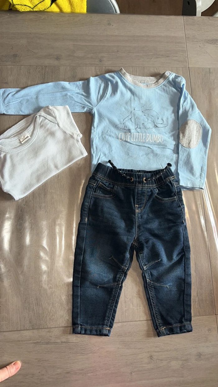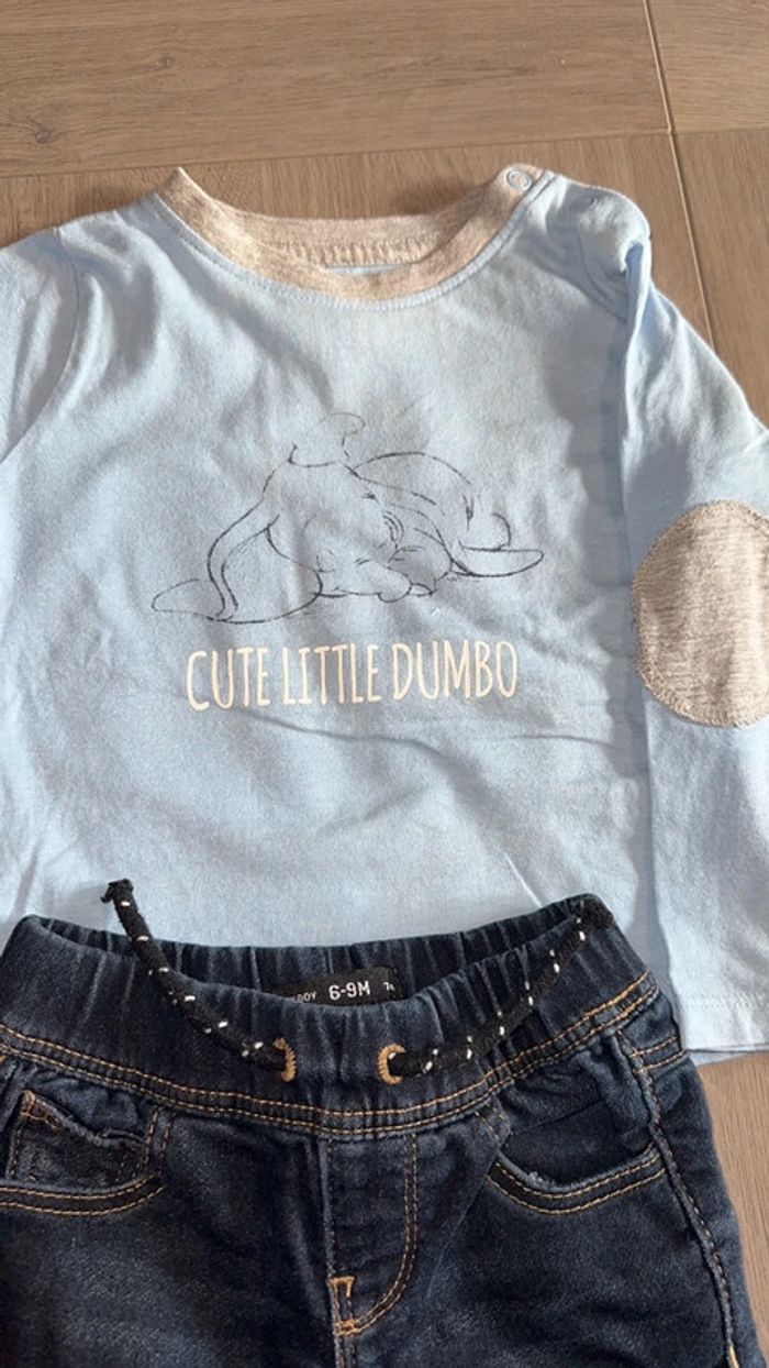 Joli ensemble t-shirt manches longues et pantalon type leggings mais façon jeans très confortable . Je met avec un tricot de peau taille 12 mois. État proche du neuf Taille 9 mois #dumbo #disney #primark #leggings #jeans