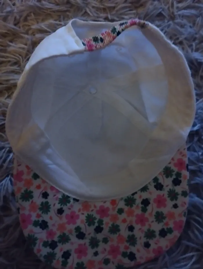 Casquette fleurie et blanche sans étiquette. Ne va pas à une fillette de 4 ans.