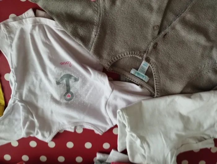 Lot de 6 vêtements 6 mois et un legging rose 12 mois Deux gilets 3 hauts Un legging jaune Un legging rose 12 mois