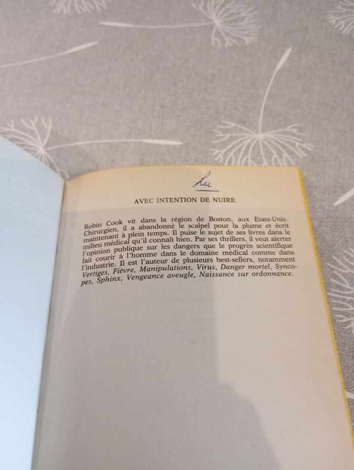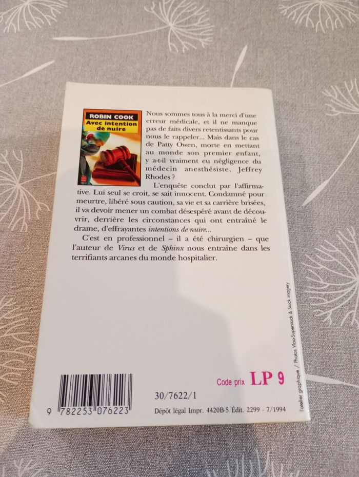 Livre "Avec intention de nuire" de Robin Cook. Editions Le livre de poche. Très bon état mais inscription "Lu".