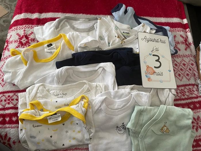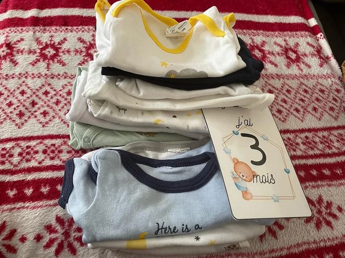 Lot de12 bodies manches courtes, taille 3 mois en très bon état. Plusieurs marques ; Kiabi, mot d'enfants... #3moiselodiebdvx
