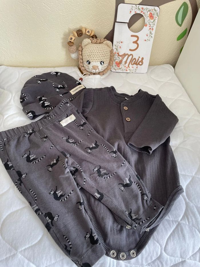 Ensemble fin 3 pièces, bodies, pantalon + bonnet. Un peu boulocher sur le genou gauche, sinon en très bon état. Taille 3 mois #3moiselodiebdvx