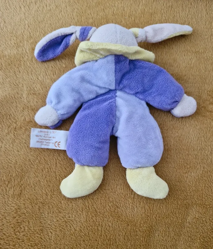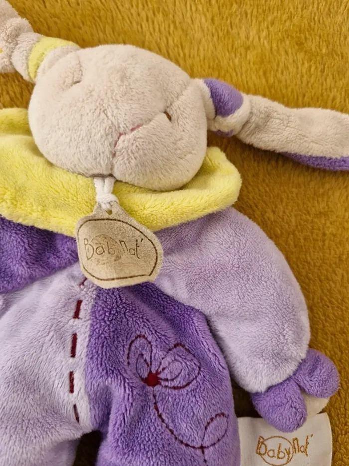 #peluche #doudou #lapin #violet #jaune #clown collection #noeud #babynat #doudoumelodyriri31