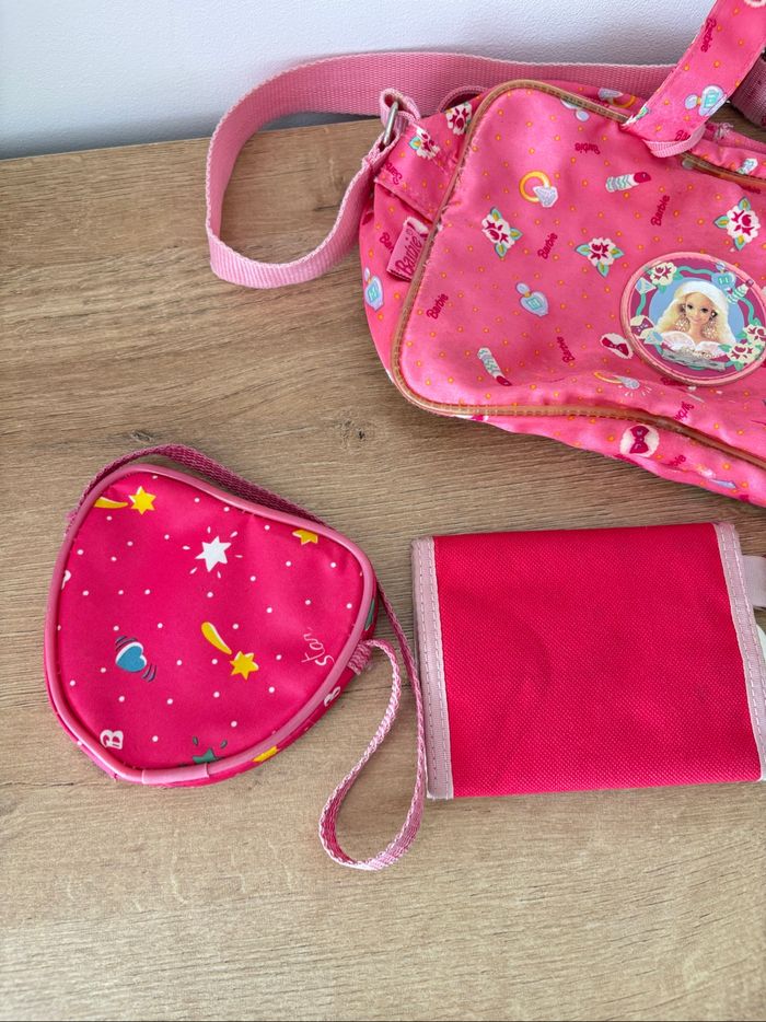 Lot de 3 articles Barbie 1 porte monnaie 1 mini sac 1 sac bandoulière !! le sac bandoulière n'est pas en bon état, il est abimé, a des taches, odeurs Il a était mal stocké mais mérite une deuxième vie Vendu en l'état