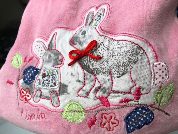 Dessins de lapins sur l’avant, avec des broderies de fleurs, feuilles…vertes, rouges, bleues.