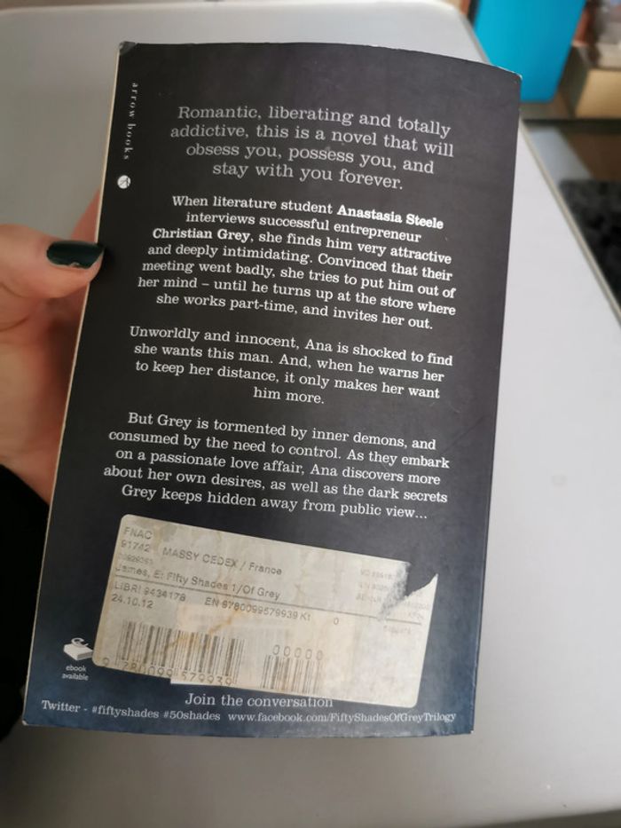 Livre en anglais, Fifty Shades of Grey, El James, éd. arrow books, 2012, 514p., 354g. Livre au format broché, couverture souple, bon état général, la tranche est tachée en dessous, pliure sur la couverture. #livreenanglais #fiftyshadowofgrey #eljames