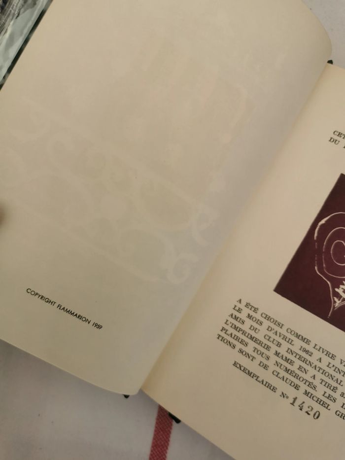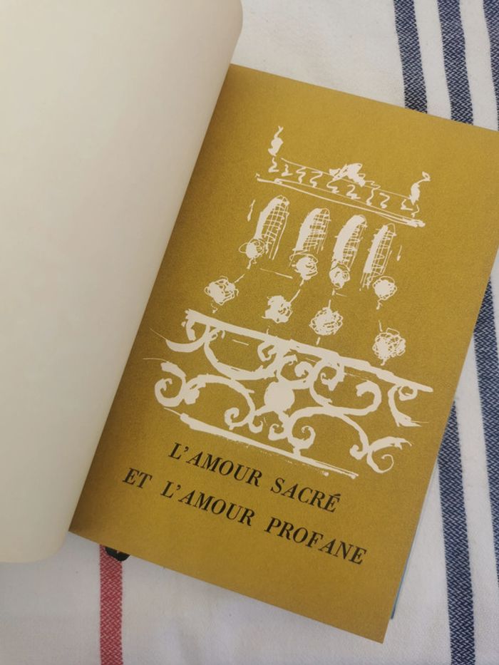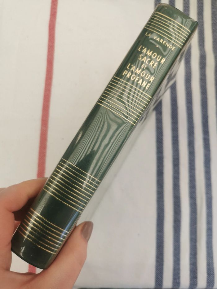 Beau vieux livre neuf, mais la tranche est un peu tachée, couverture rigide dans sa protection plastifiée, livre relié, illustré au début. Edition Flammarion, 1959, exemplaire N°1420/3000. Cet ouvrage publié par l’Ambassade du Livre, Paris, a été choisi comme livre vedette pour le mois d’avril 1962, à l’intention des amis du club international du livre, 373p., 600g. #livreneuf #lavarende #amoursacre #amourprofane
