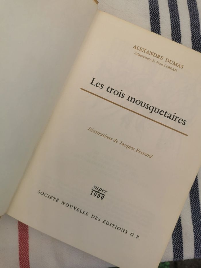 Vieux livre neuf, mais le dessus de la tranche est taché. Les Trois Mousquetaires d’Alexandre Dumas, illustrations de Jacques Pecnard, éd. Société Nouvelle des Editions G.P., col. Super 1000, 1960, 250p., 428g. Beau livre illustré, dans sa couverture rigide en toile, relié. #lestroismousquetaires #alexandredumas