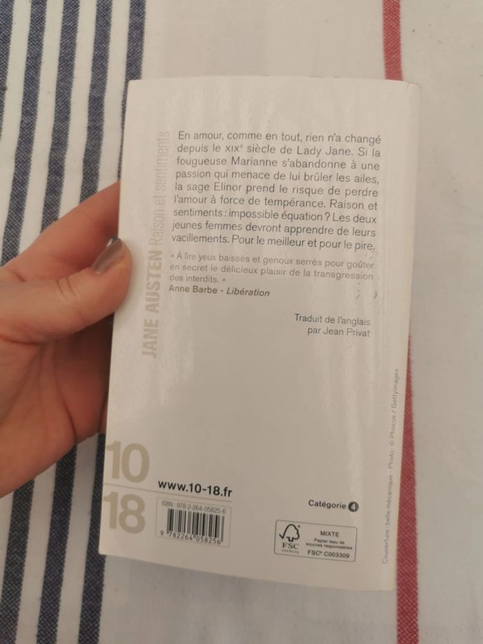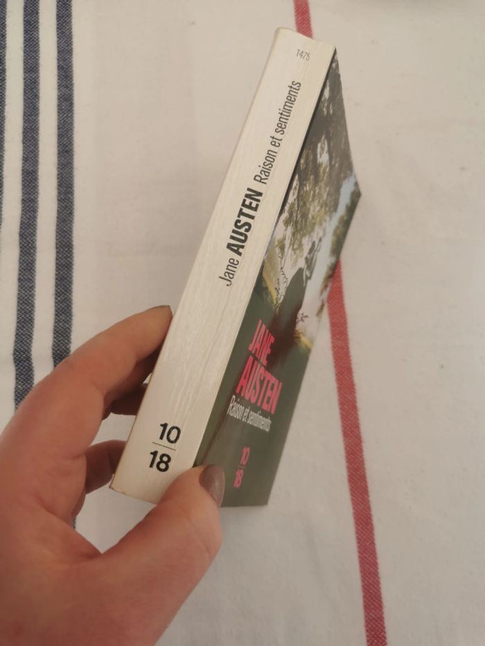Jane Austen, Raison et sentiments, éd. 1018, 2013, 382p., 245g. Le livre est au format poche, en bon état général, comporte des taches de jaunissements à l'intérieur de la couverture t un peu sur la tranche. #janeausten #raisonetsentiments #livredepoche