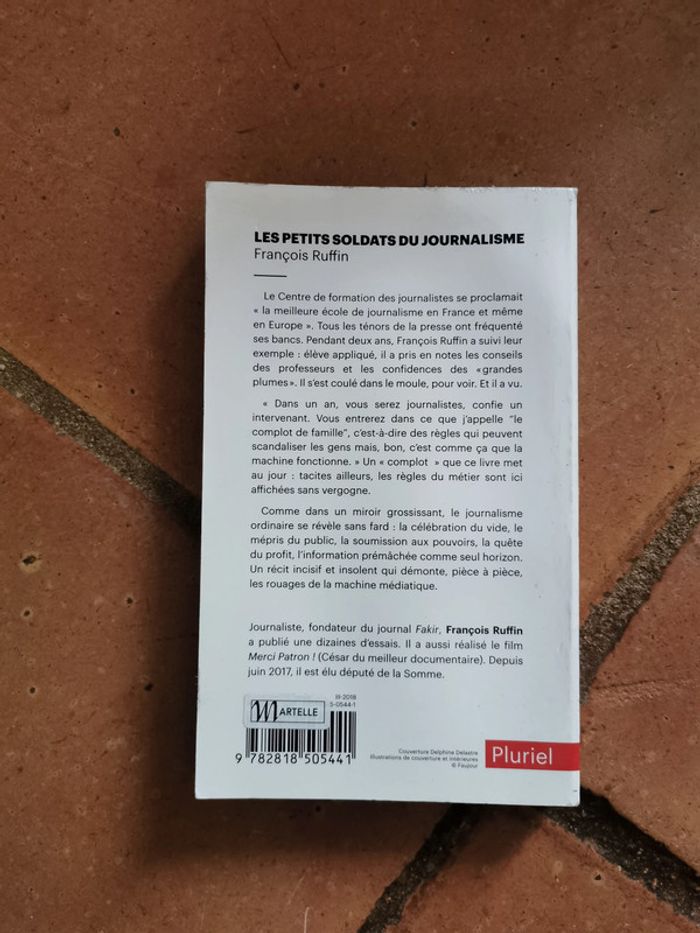 Les petits soldats du Journalisme, livre de François Ruffin. Livre de poche, éd. Pluriel, dessins de Faujour, 2014, 271 p., 217g. Le livre est neuf, mais a pris l'eau, le dessus de livre est marqué. #lespetitssoldats #pluriel #journalisme #francoisruffin