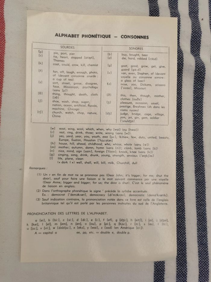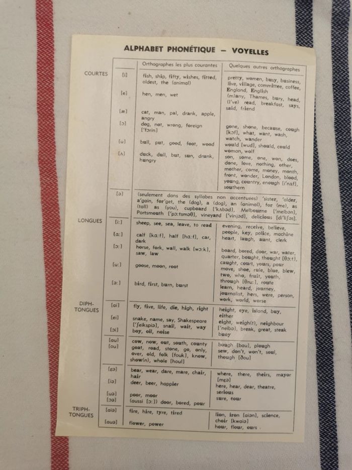 Fiche Alphabet Phonétique Anglais- consonnes d'un côté et les voyelles de l'autre, une feuille légérement plastifiée, en très bon état général. #fichealphabet #ficheanglais #voyelles #consonnes