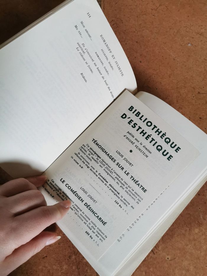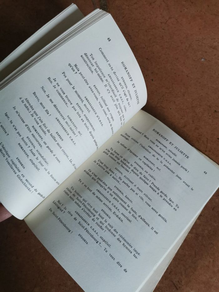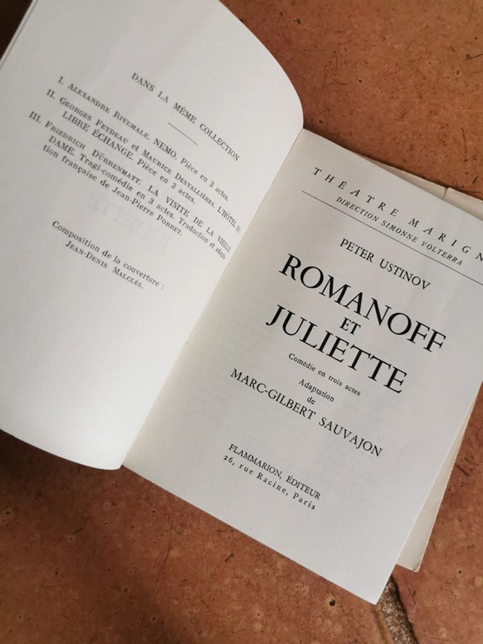 Théâtre Marigny, livre de Peter Ustinov Romanoff et Juliette, coméie en trois ates Adaptation de Mrc-Gilbert Sauvajon. Théâtre Maigny, direction Simonne Volterra, éd. Flammarion, 1957, 154p., 142g. Livre au format relié dans sa jolie jaquette téché, un peu déchiré, le livre même est en très bon état. #theatremarigny #theatre #roumanoff #juliette #peterustinov #comedie