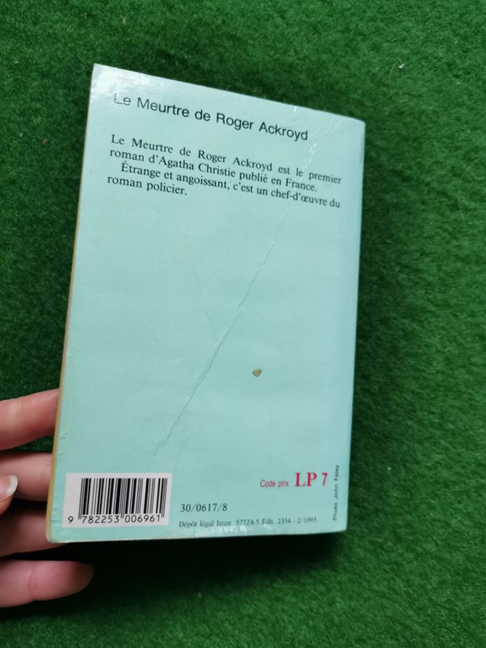 Agatha Christie, le meurtre de Roger Ackroyd, éd. et format livre de poche, 1993, 317p., 142g. Livre est en bon état général, la couverture comporte les pliures, les traces d'eau sur les dernières pages (sans odeur, sec). #agathachristie #lemeurtre #rogerackroyd #livredepoche