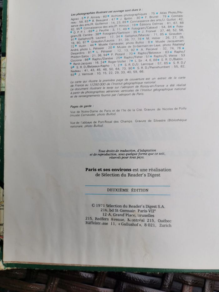 Autoguid, Paris et ses environs. Le guide est ancien, éd. Séléction du Reader's Digest, 1971, 2ème édition, 337p., 82g. Bon état général, quelques traces d'humidité, les coins des pages 323-337 sont endommagés. Couverture rigide, grand format, relié, signé. #autoguid #parisetsesenvirons #autoguid1971