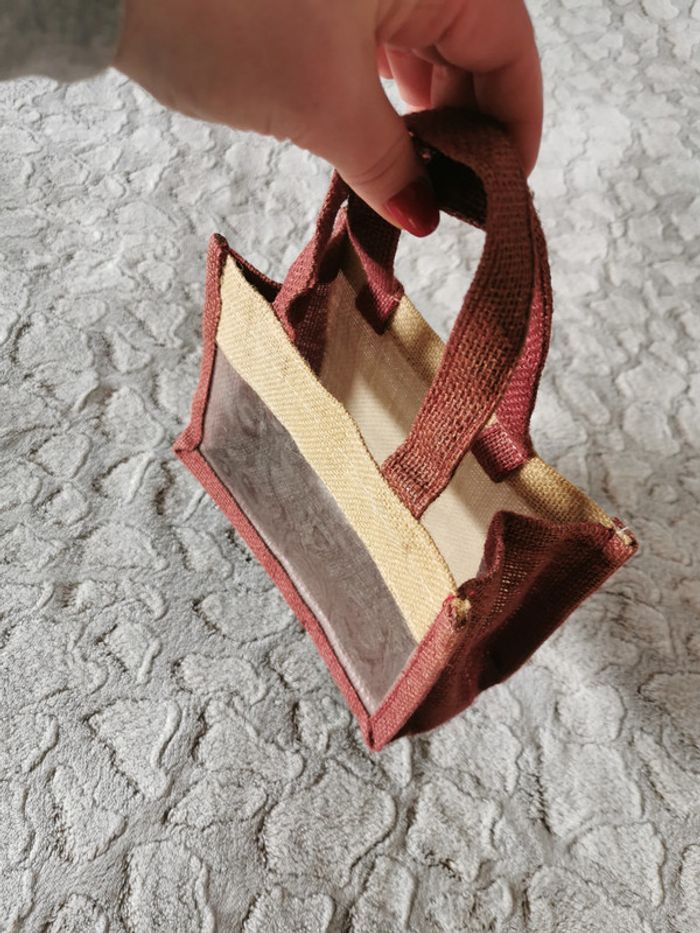 Mini sac cabas transparent devant en toile de jute. Tout petit sac en toile de jute beige et rouge bordeaux, neuf sans étiquette. Dimensions : Hauteur : 14 cm Largeur : 20 cm Epaisseur : 7,5 cm Poids : 68g #saccabas #sacjute #minisac