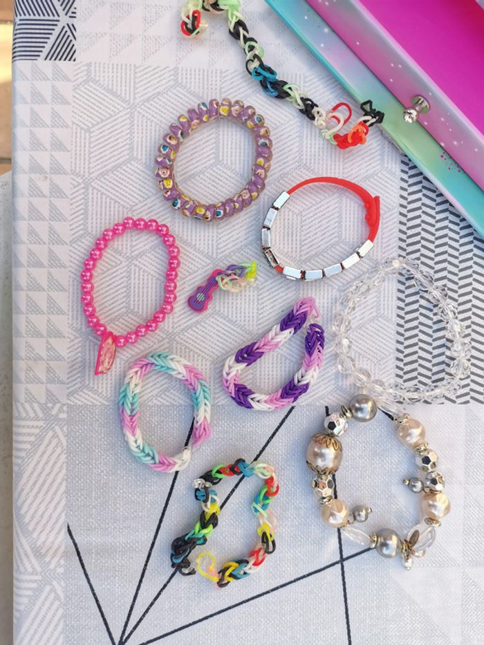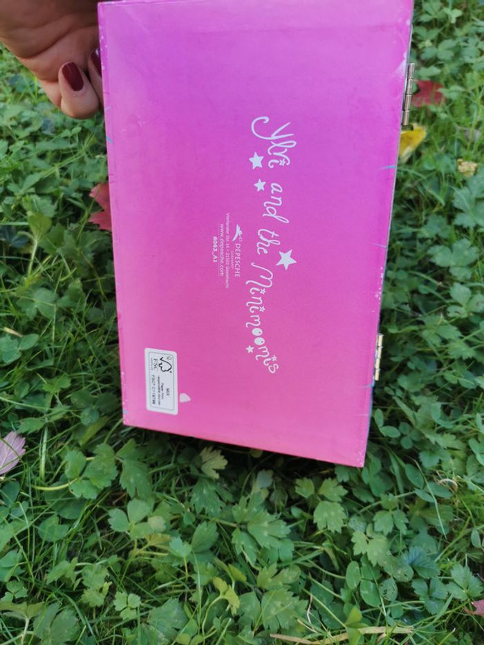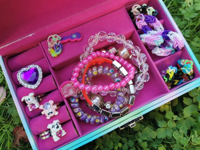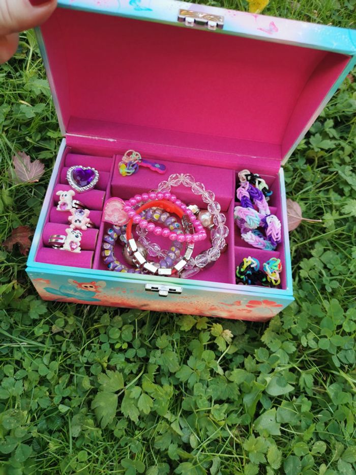 Boite ou coffre à bijoux, dans le style de princesse animé, dans les couleurs bleu et rose avec des paillettes, boîte à compartiment remplie de bijoux divers comme bracelet et bagues. Boite en carton, bon état général, un peu marquée à l’intérieur, le fermoir ne fonctionne plus, le couvercle se ferme, mais pas à clé. A l’intérieur plein de petits compartiments pour bagues et autres rangements de bijoux. Taille de la boite H9,5xL17,7xP11,5 cm, poids 400g #coffretbijoux #bijouxenfant #boitebijouxenfants #braceletsfille