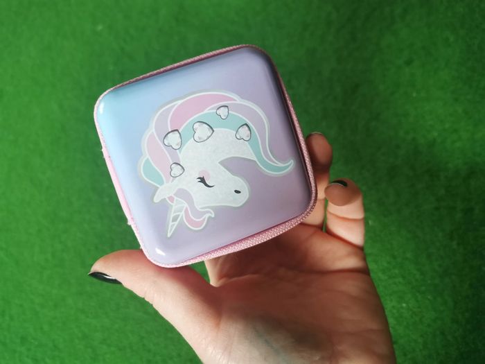 Boîte licorne en métal à fermeture éclair. Petite boîte pochette de rangement de bijoux, écouteurs ou tout autre petit objet, elle est en très bon état, de forme carrée. Dimensions : Hauteur : 3,5 cm Largeur : 7x7 cm Poids : 39g #boitelicorne #licorne #boiteabijoux #boitemetal #boiterose