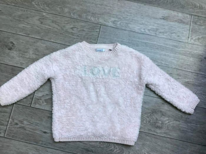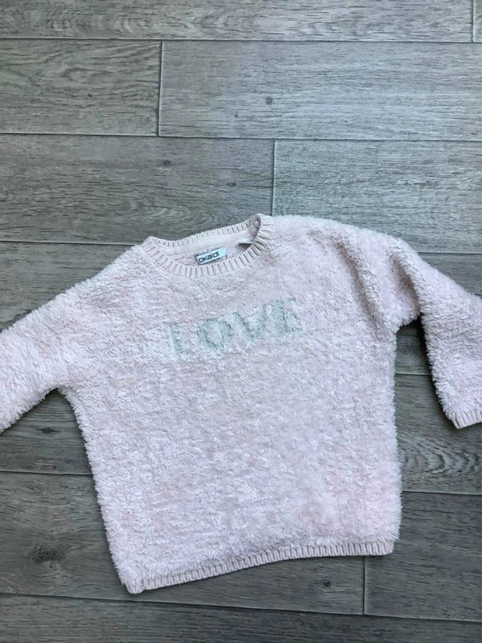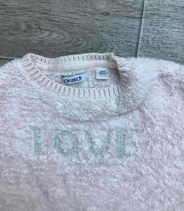 Pull doux rose pastel Inscription « Love » argenté Okaidi 3 ans Fille 3 ans #ingridblogmode3ans 📦 Envoi soigné 🏠 Non fumeur