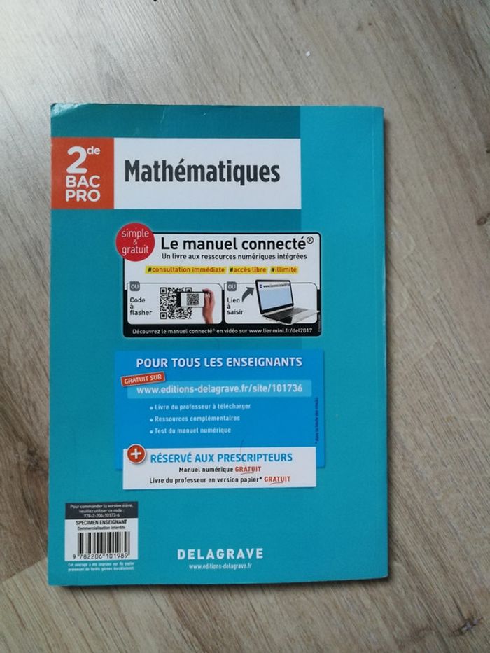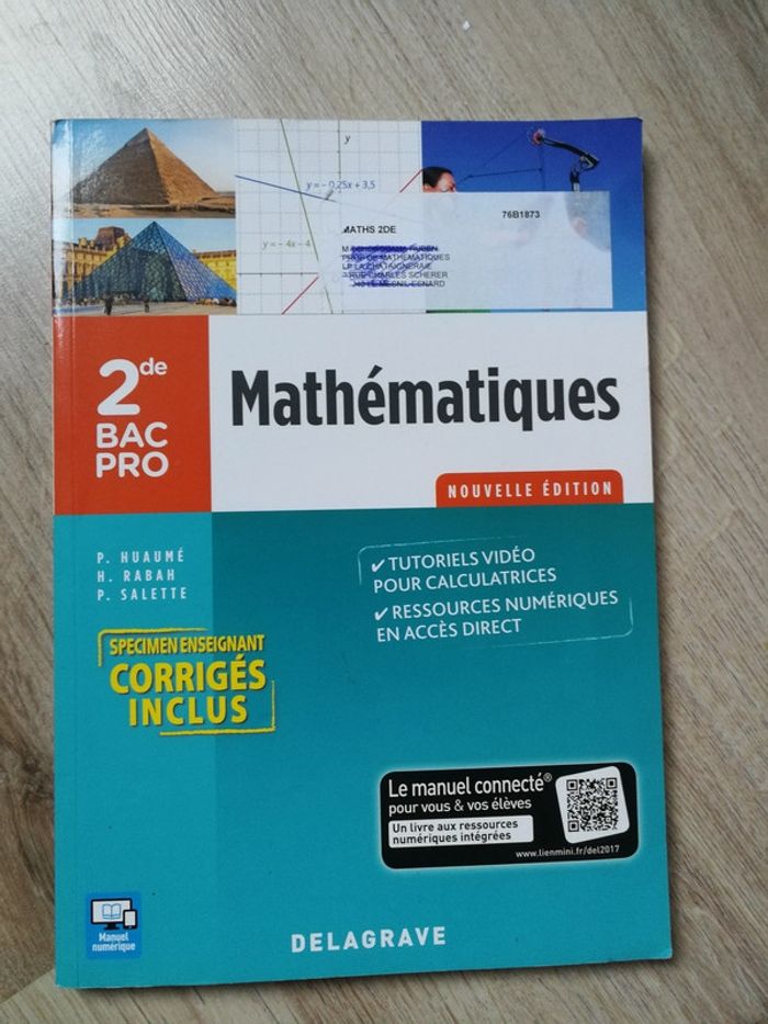 Mathématiques 2de BAC PRO, éd. Delagrave, Nouvelle édition, spécimen enseignant corrigés inclus, 2017, 143p., 500g. Le manuel est en très bon état, comme neuf, une page s'est détachée, mais présente, une étiquette collée sur la couverture. Pensez à faire des lots afin de bénéficier des remises que j'ai régulièrement sur ma page. #mathematiques #bacpro #delgrave #manuelenseignant