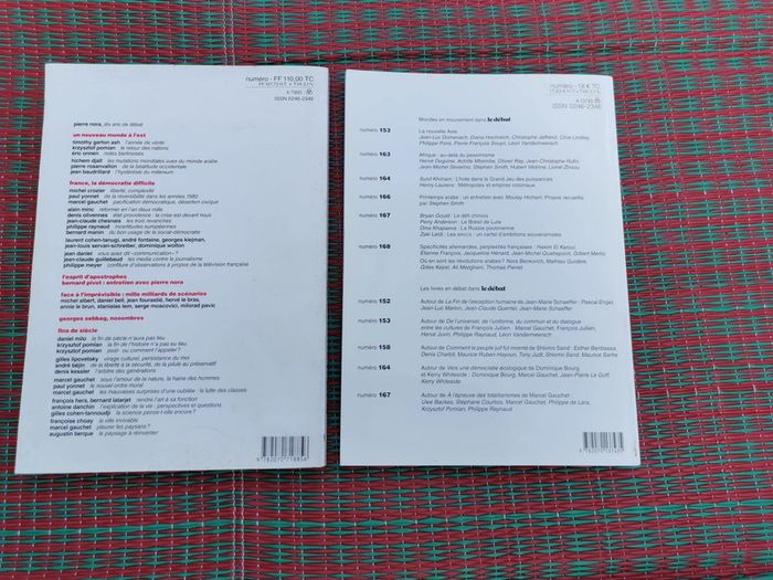 Le débat, éd. Gallimard lot de 2 livres, le lot n'est pas dissociable, en bon état général, le N°60 a des taches de jaunissement sur le tranche et le N°169 est en très bon état. Le lot comprend : 1. Le débat histoire, politique, société, 10 ans, N°60, mai-août 1990, 320p., 553g. 2. Le débat histoire, politique, société, N°169, mars-avril 2012, 192p., 389g. Poids du lot 1,1kg. Pensez à faire des lots afin de bénéficier des remises que j'ai régulièrement sur ma page. #ledebat #politique #lotdelivres #livrespolitique