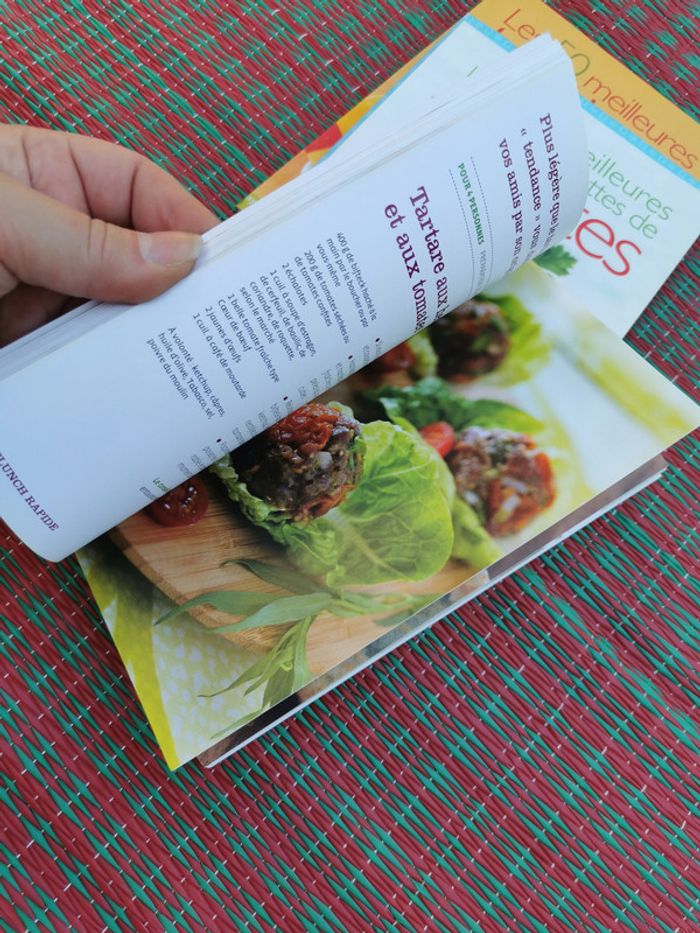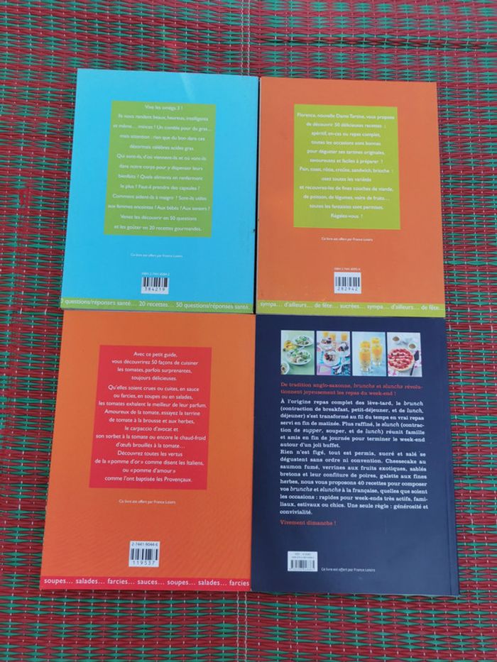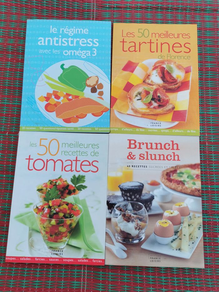 Lot de 4 petits livres de recettes, éd. France Loisirs, le lot n'est pas dissociable, l'intérieur est en très bon état, les tranches du dessus sont marquées par les jaunissements. Le lot comprend : 1. Brunch & Slunch, 40 recettes sucrées et salées, 2012, 62p. 2. Les 50 meilleures de recettes de tomates, 2006, 62p. 3. Le Régime antistress avec les Oméga 3, 2005, 59p. 4. Les 50 meilleures tartines de Florence, 2005, 62p. Poids du lot fait 558g. Pensez à faire des lots afin de bénéficier des remises que j'ai régulièrement sur ma page. #lotdelivres #livresderecettes #ivredecuisine #recettes #cuisine